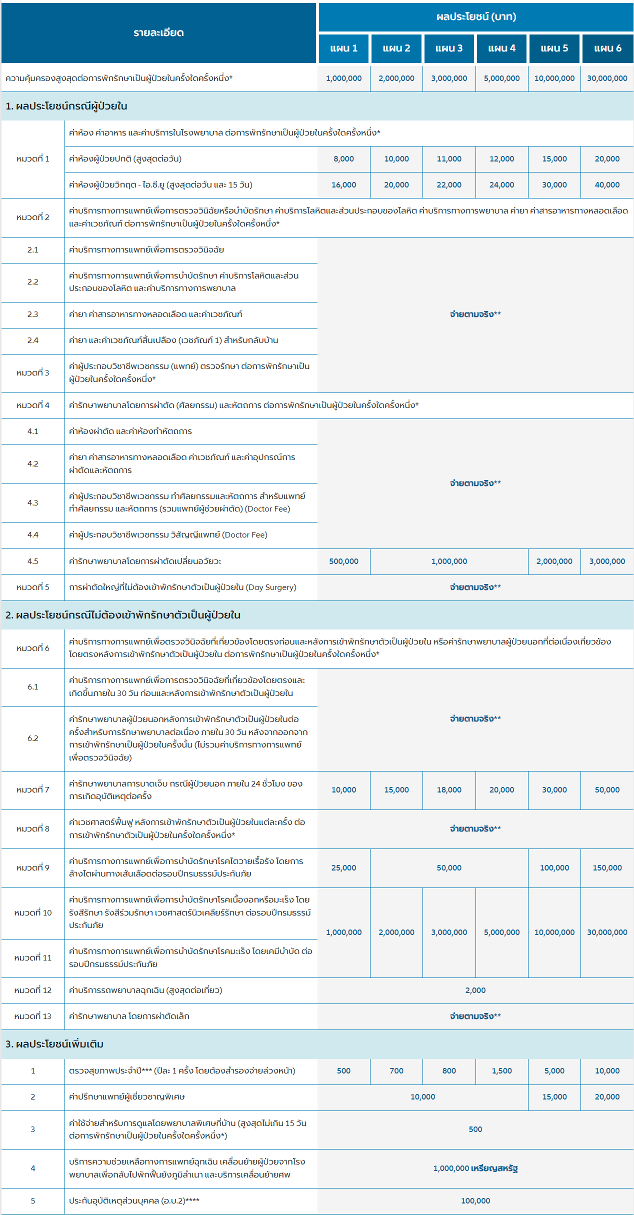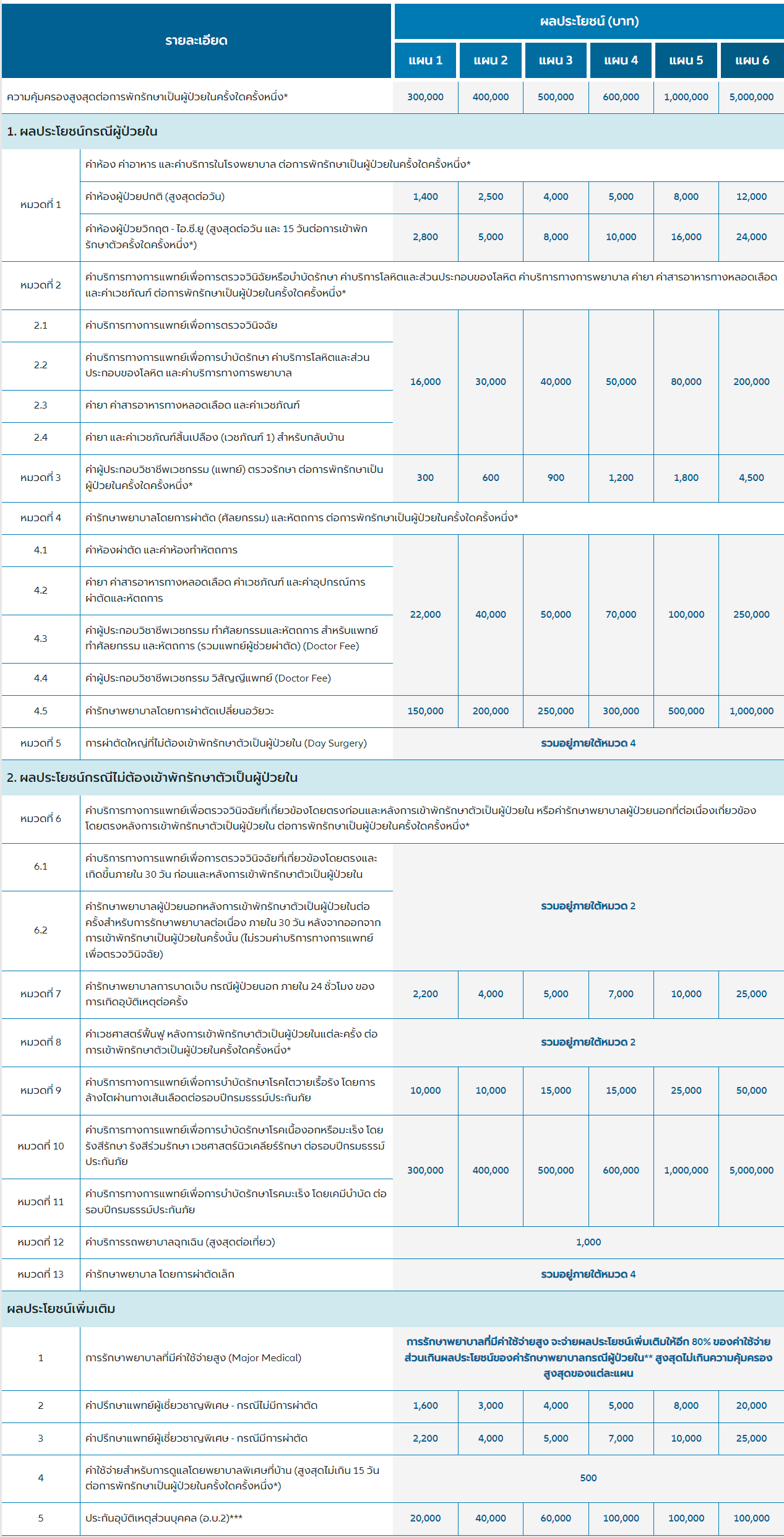 ***ความรับผิดส่วนแรกพิจารณารวมภายในความคุ้มครองผู้ป่วยใน (ทั้ง 13 หมวด) รวมถึงค่าพยาบาลพิเศษที่บ้านและแพทย์ผู้เชี่ยวชาญพิเศษด้วย ทั้งนี้ไม่รวมถึง ความคุ้มครองสูติกรรม, ตรวจสุขภาพ, ผู้ป่วยนอก และอุบัติเหตุส่วนบุคคล (อบ.2)